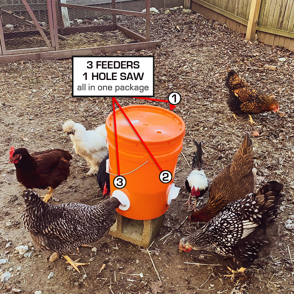 Invented by a USA farmer and designed for durability and simplicity. This DIY poultry pro feeder system already comes with a 3 inch Hole Saw so that you can install your 3 port feeders in just minutes.